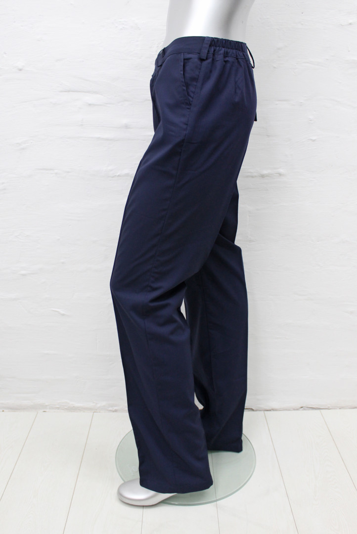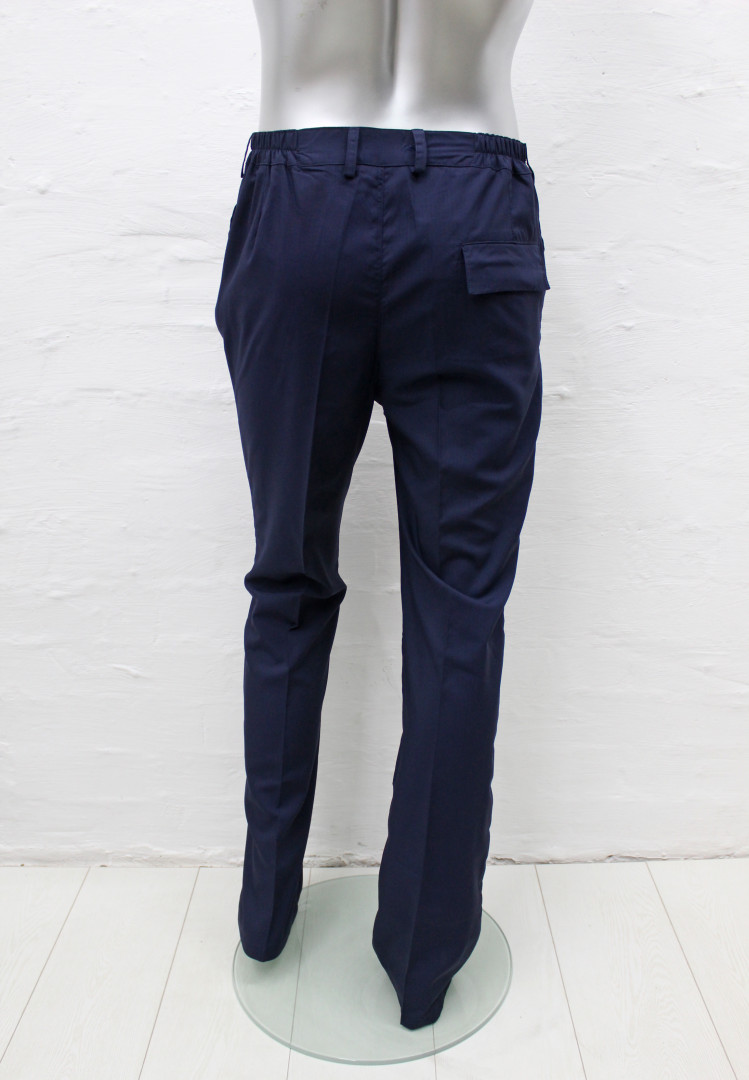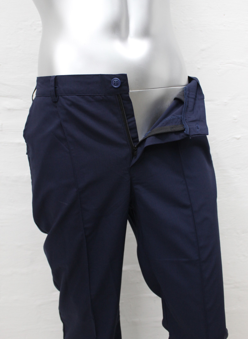 Пояс с широкими шлевками и вшитой резинкой, регулирующей объем талии. Имеются два врезных кармана по бокам, и один задний на липучках. На передней части брюк фиксированные стрелки по длине брюк.