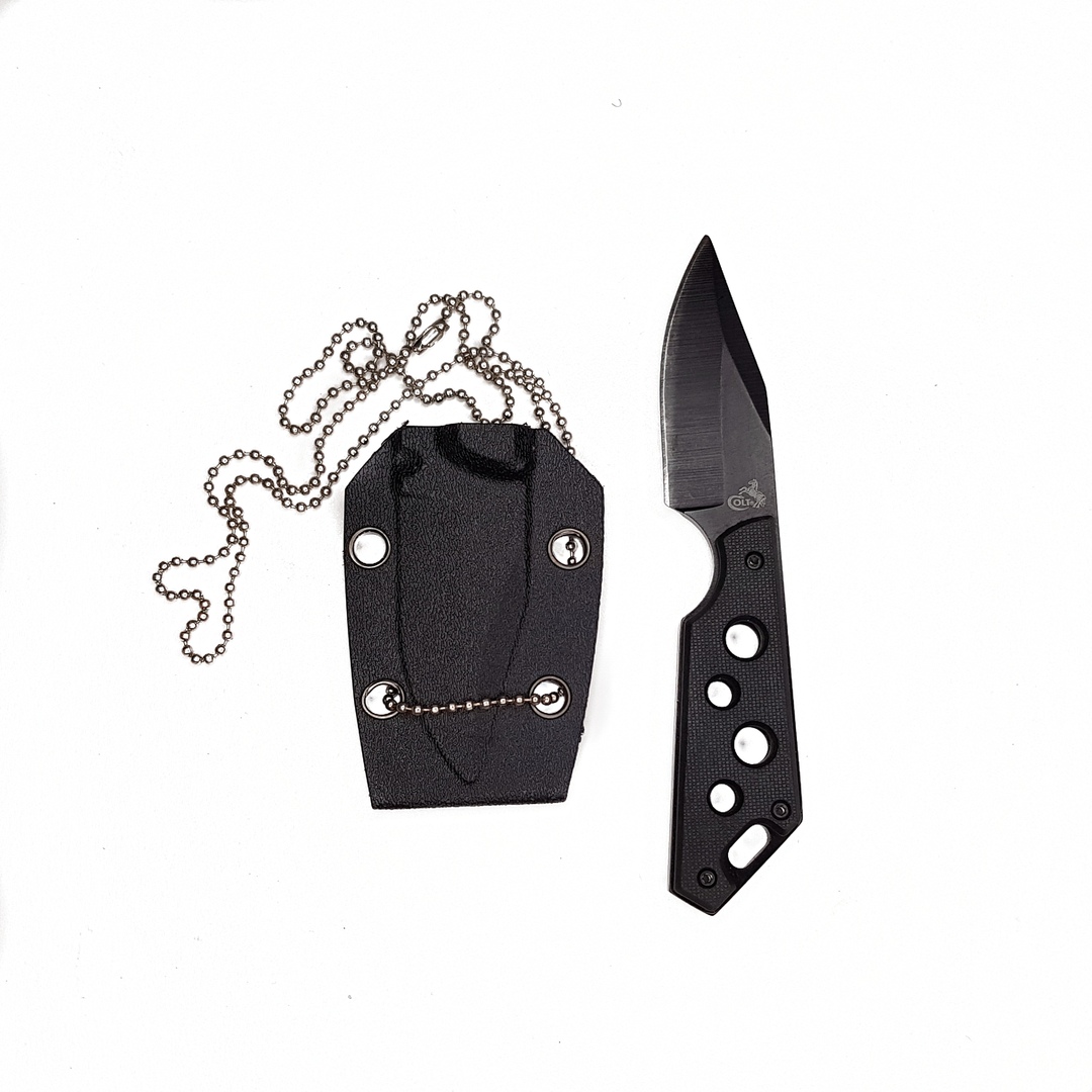 Нож Colt Neck Knife черного цвета с неподвижным клинком выполнен из нержавеющей стали, идет в комплекте с ножнами на цепочке для ношеня на шее. Длинна ножа от острия клинка до конца рукояти -14,5 см.