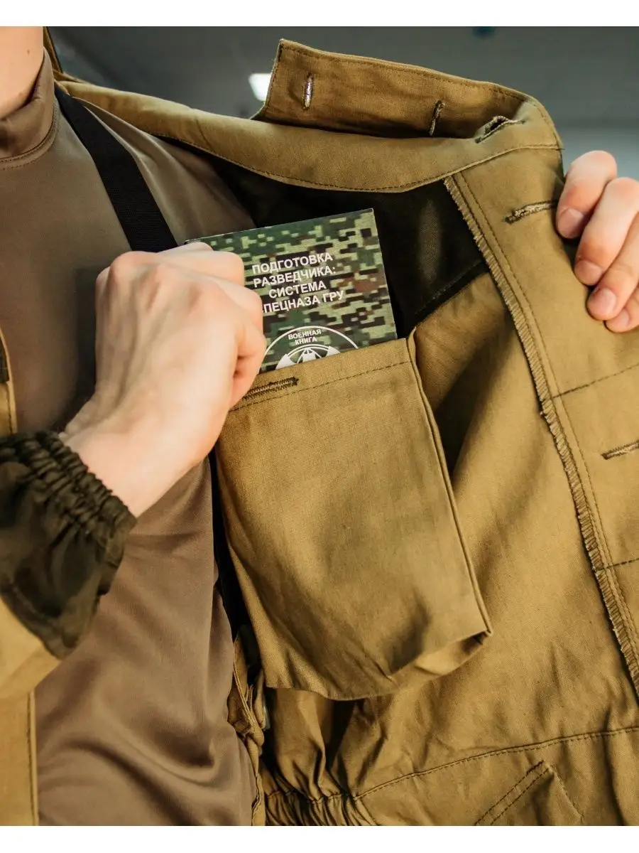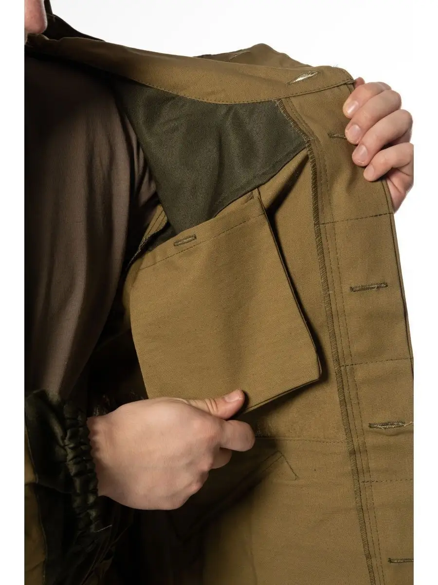 Штормовой горный костюм Горка 3. Костюм камуфляжный маскировочный можно носить в демисезон (ткань костюма плотная). Популярен среди военнослужащих, охотников, рыбаков и туристов. Костюм тактический состоит: куртка, брюки, подтяжки. Материал палаточное полотно, 100% хлопок. Куртка свободного кроя. Застёжка центральная на петлю и пуговицу. Кокетка, накладки и карманы из отделочной ткани. 2 нижних прорезных кармана с клапаном, на петлю и пуговицу. На рукавах по 1 накладному наклонному карману с клапаном на петлю и пуговицу. В области локтя усиливающие фигурные накладки, низ рукавов на резинке. Капюшон двойной, с козырьком, имеет утягивающую кулису для регулировки по объему, подгонка по талии с помощью кулиски. Брюки свободного покроя, в области коленей, на задних половинках брюк в области сидения усиливающие накладки, 2 боковых накладных кармана с клапаном. Крой деталей в области коленей препятствует их вытягиванию.