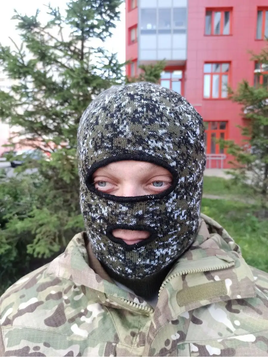 Универсальная шапка, маска балаклава на флисе. Текстильный головной убор камуфляжного, зеленого (зеленая цифра) цвета полностью закрывает голову и шею, оставляя открытыми только глаза и рот, практически полностью исключают узнаваемость. Балаклава тактическая создана для защиты лица от обморожения в условиях аномально низких температур и надежной ветрозащиты. Материал полушерсть, двойной вязки. Шапка, утепленная с внутренней стороны флисом, по низу оформлена широкой резинкой. Приятная на ощупь, не раздражает кожу лица и шеи, гипоаллергенная. Размер универсальный. Подходит мужчинам и женщинам, унисекс. Вязаная балаклава обладает высокими теплосберегающими свойствами, заменяет шапку и шарф-снуд. Защитный аксессуар надевают для активностей в холодное время года: прогулок, езды на снегоходе, катании на сноуборде, лыжах и коньках. А также для зимней рыбалки и охоты, туризма. Балаклава зимняя мужская универсальная, комфортна под военным армейским шлемом или каской. Шапку используют силовые структуры при спецоперациях. Отверстия в маске обеспечивают удобное дыхание, возможность сделать глоток воды или перекусить, не ограничивает и не искажает речь.