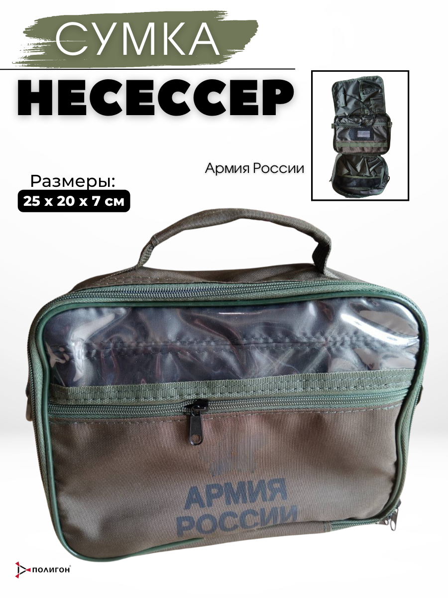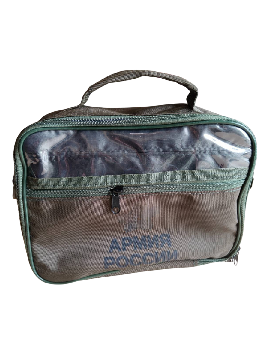 Несессер Армия России выдаётся призывникам для укладки вещей личной гигиены. Имеет много различных карманов и отсеков, полезный аксессуар для туриста, дачника, охотника и рыбака. Необходим в командировках во время профессиональной деятельности. Гигиенические приспособления солдат обязан иметь при себе во время смотра, полевого выхода и боевой тревоги. Сумка Армия России изготовлена из качественного материала, который обладает водоотталкивающими свойствами. Оснащена верхней ручкой с текстильным подручником для переноски и с двумя D-кольцами по бокам. Спереди имеется карман на молнии не глубокий. Нессер армейский имеет сзади отделение на молнии, в котором спрятан язычок с крючком, на который при использовании можно повесить. Основное большое отделение закрывается на молнию, раскладывается на 3 секции, также в нем имеется съемный модуль на липучке с прошитой лентой и биркой. На эластичный шнурок можно повесить полотенце или белье. Внутренние сетчатые карманы быстро сохнут. Размеры сумки косметички мужской 7х20х25см. Данную военную сумку косметичку используют как солдаты, так и офицеры. Занимает не много места, где аккуратно все лежит.