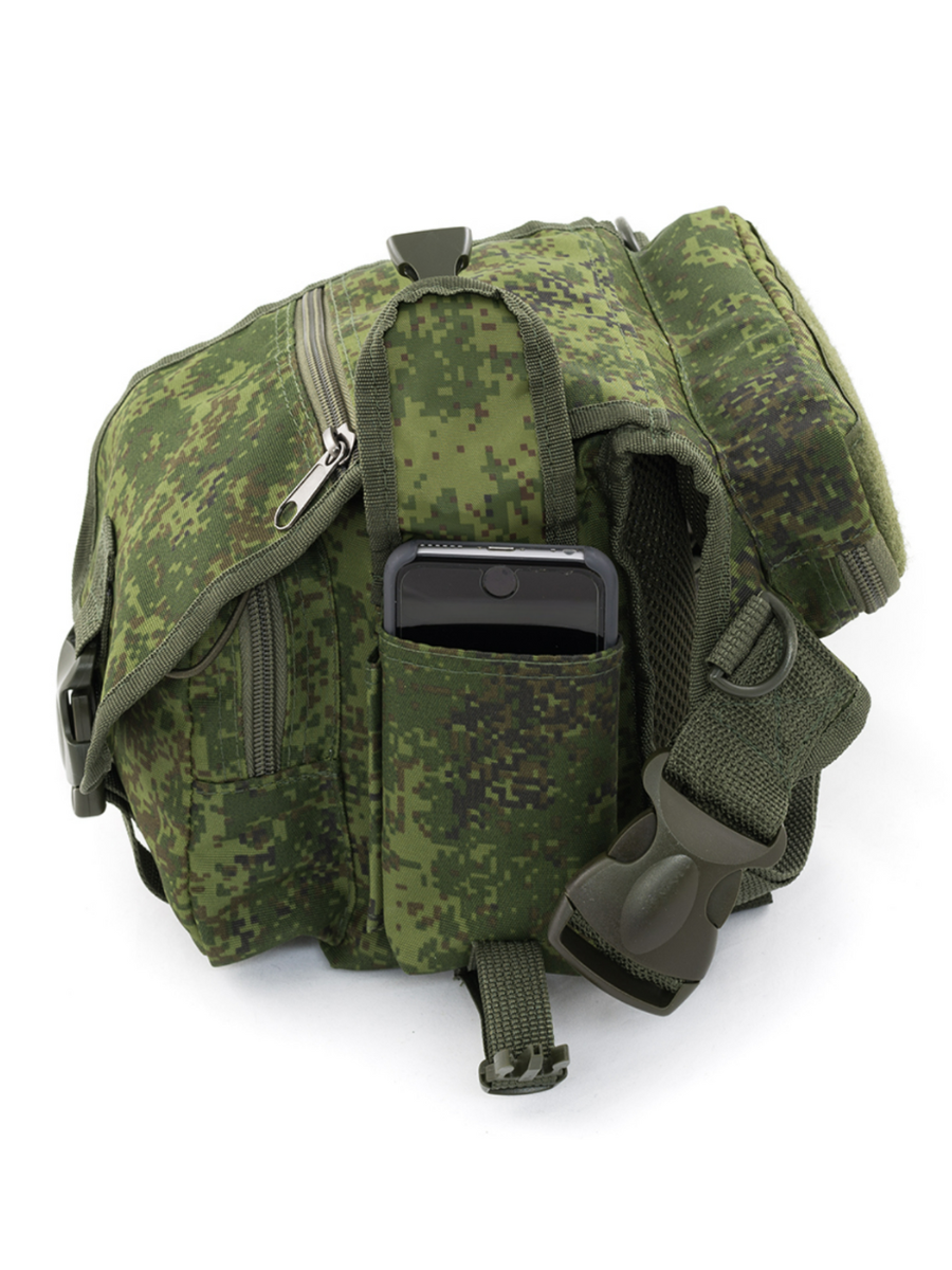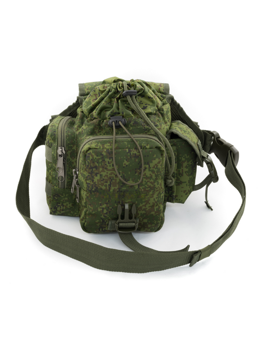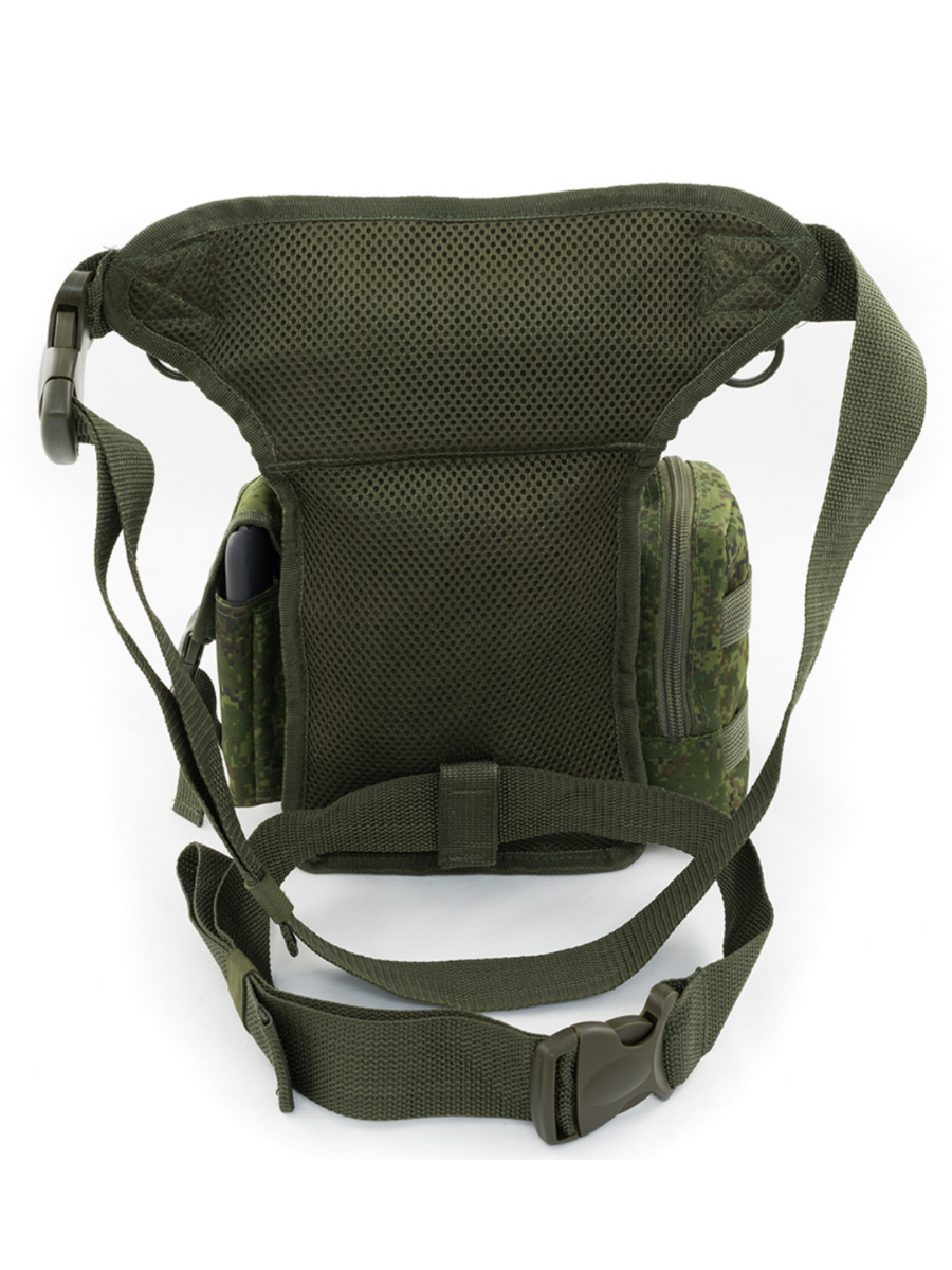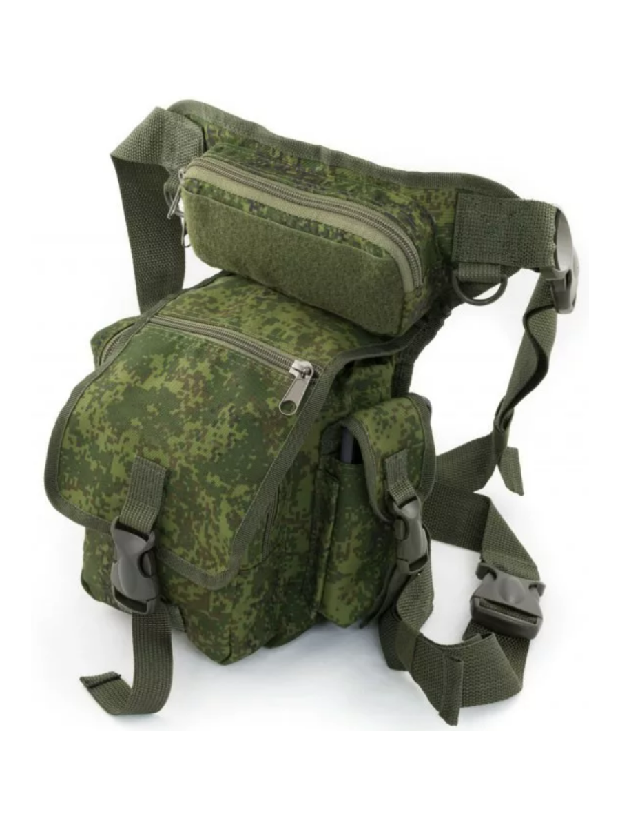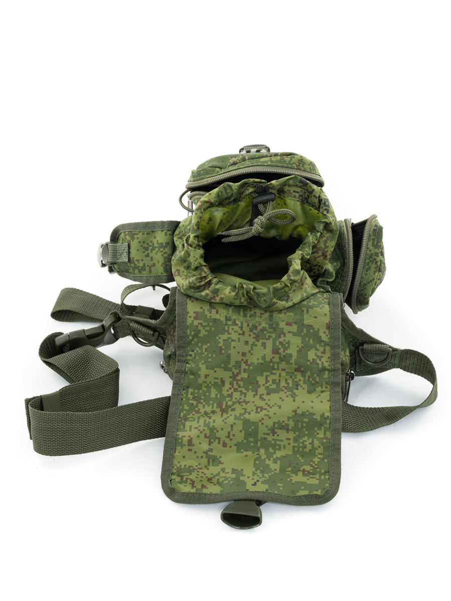 Небольшая сумка для ношения на бедре. Имеет основное отделение, которое утягивается шнуром. Четыре обьёмных кармана на молнии разного формата. Задняя стенка из трёхслойной сетки для микропроветривания. Двойное крепление на пояс и на бедро. На бедро сьёмный крепёж. Материал водооталкивающий (кондор)