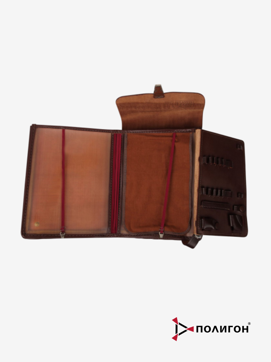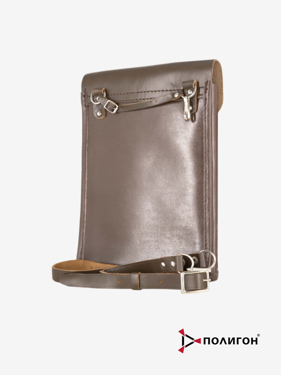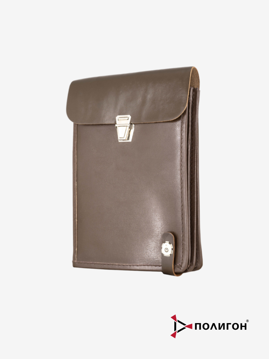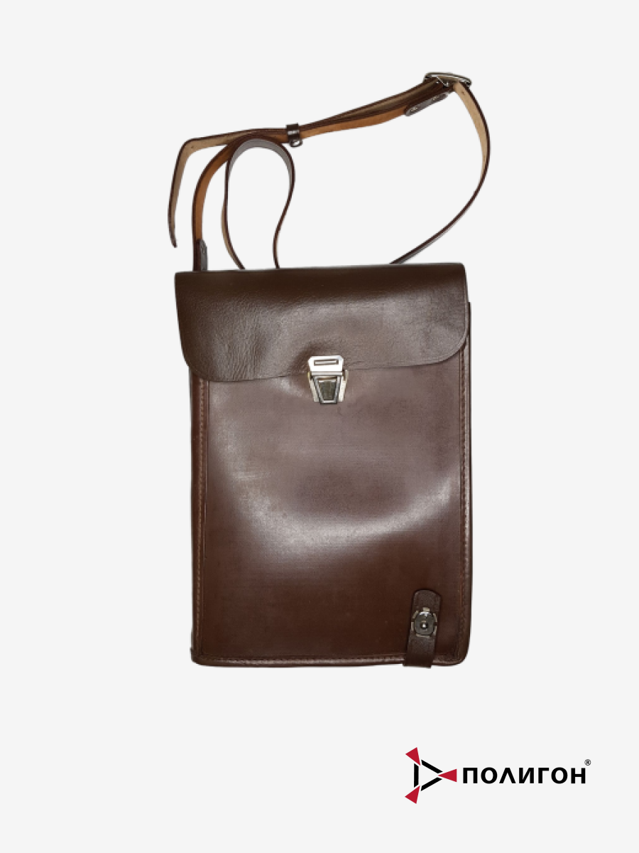 Сумка полевая офицерская кожаная, представлена в коричневом цвете. Специальная сумка для командного (начальствующего) состава (офицеров, прапорщиков и сержантов) из кожи используемая для переноски, хранения и использования рабочих документов. Внутри сумки предусмотрены: Отделение для карт и топографических схем, расположенное под прозрачным пластиковым окном; Письменных принадлежностей и необходимого для командного состава инструмента (держатели для карандашей и ручек, линейки, циркуля, карманы для письменных принадлежностей, курвиметра, компаса); Вместительный отсек для хранения бумаг. Фурнитура - металлическая с блестящим никелированным покрытием. Сумка укомплектована длинным съемным регулируемым наплечным ремнем. Данная модель была популярна у офицеров ВС СССР.