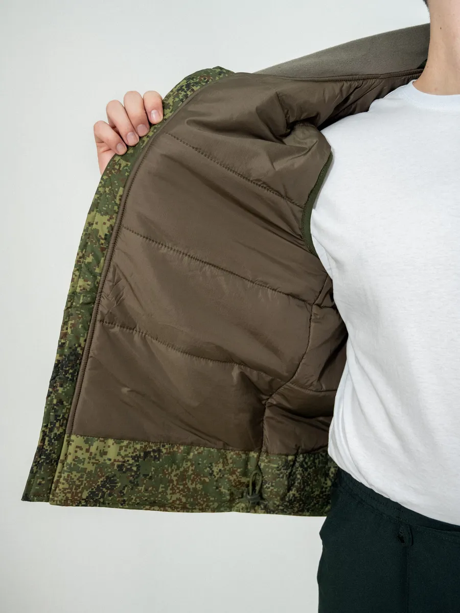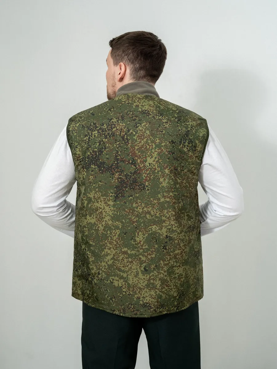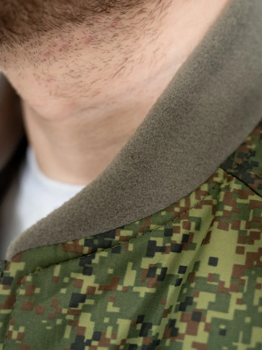 Жилет утепленный на подкладке входит во всесезонный комплект полевого обмундирования 7 уровень (ВКПО, ранее ВКБО). Жилет из комплекта вкпо используется как дополнительный изолирующий слой. В армейском жилете предусмотрен флисовый воротник, а также бортовая застежка на двух замковую молнию с внутренней ветрозащитной планкой. Спереди военного жилета вкпо расположены накладные карманы. По линии талии жилет регулируется фиксатором из эластичной шнуровки.